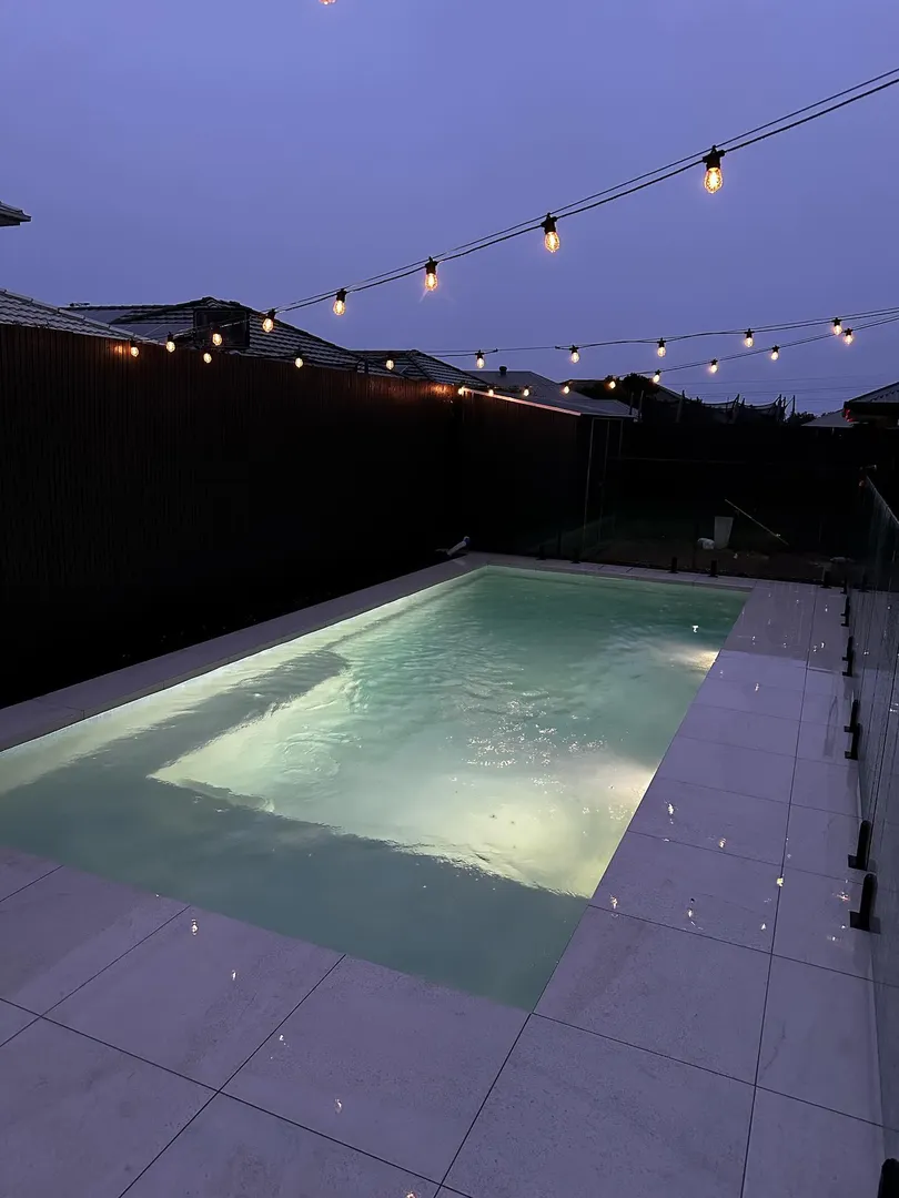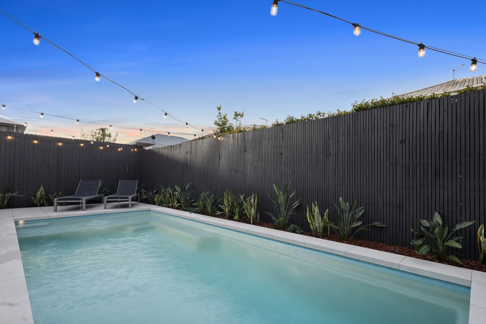 Modern backyard pool with string lights at dusk.