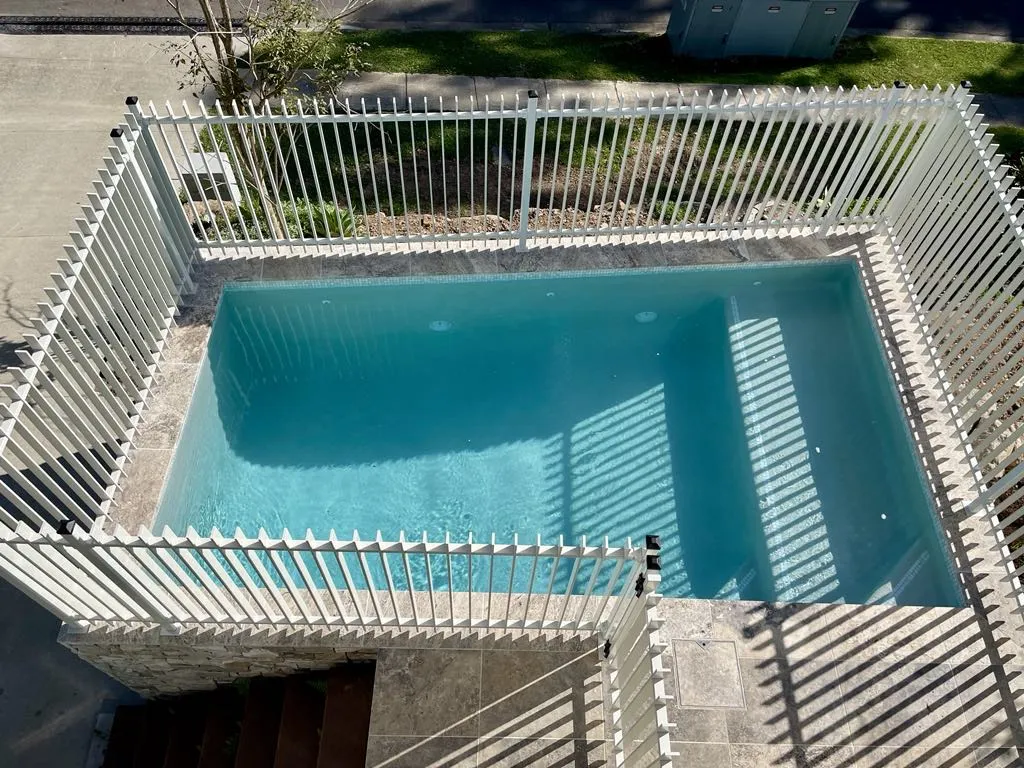 Front yard pool with safety fence and garden view.